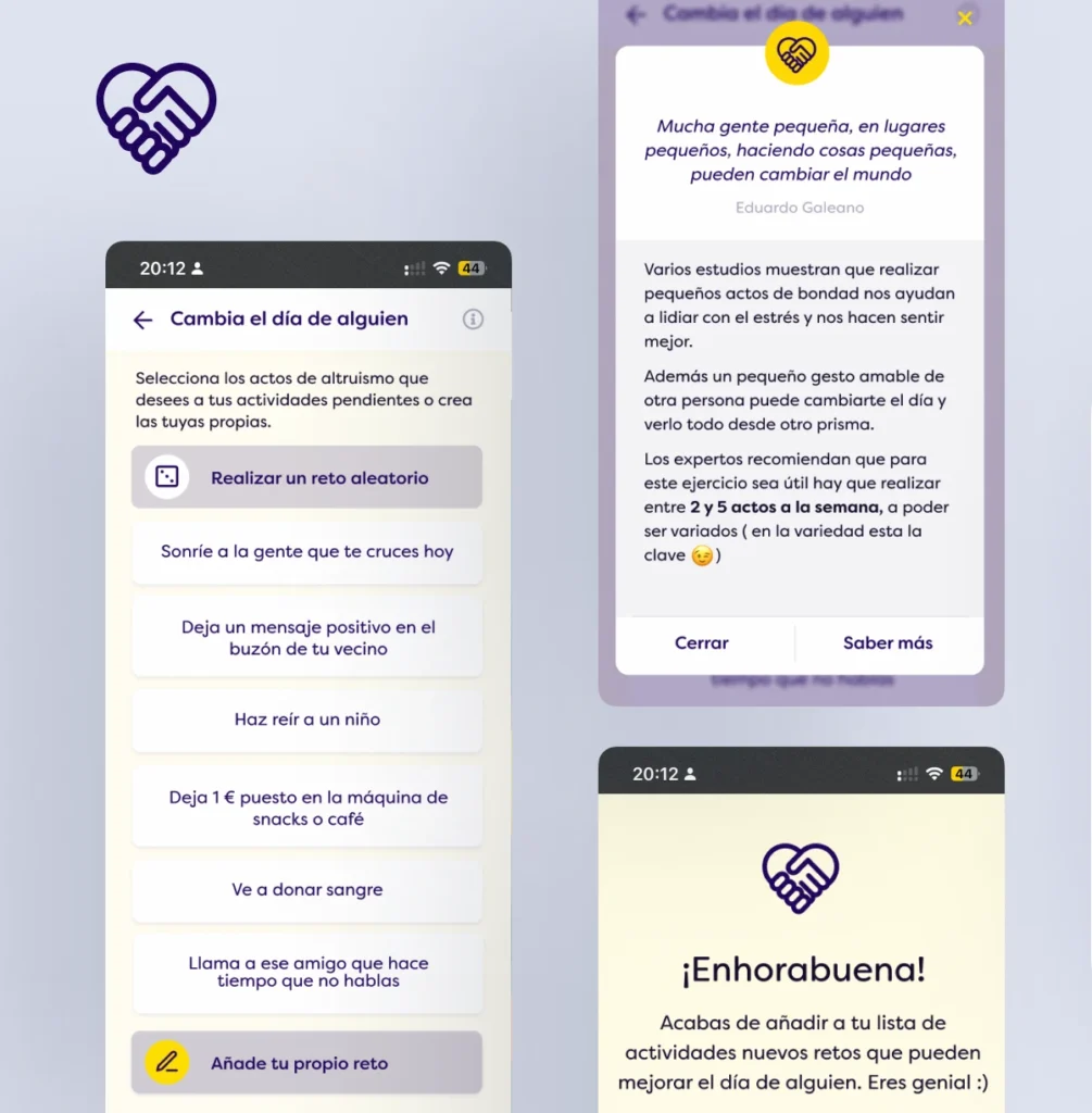 El proyecto dio lugar a un case study completo que recoge desde la fase de investigación (desk research, encuestas y entrevistas), hasta la creación de arquetipos, la ideación, el diseño de wireframes y la evolución hacia un prototipo final interactivo. Se ha trabajado UX Research, Visual Design y UX Writing para crear una experiencia de bienestar digital, con un tono cercano, alegre y una interfaz clara.