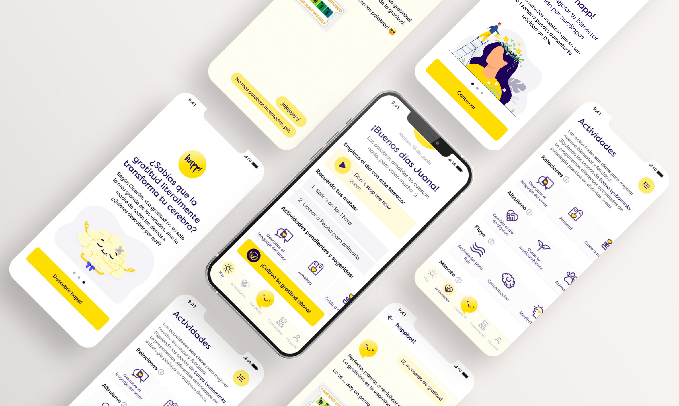 Happ! es un proyecto personal que surgió de nuestro interés por la Psicología Positiva. Inspiradas por los libros “La ciencia de la felicidad” de Sonya Lyubomirsky y “Why we love or hate everyday things” de Donald Norman, quisimos diseñar un producto digital que mejorara el bienestar apoyándonos en estas dos formas de acercarse a la felicidad.