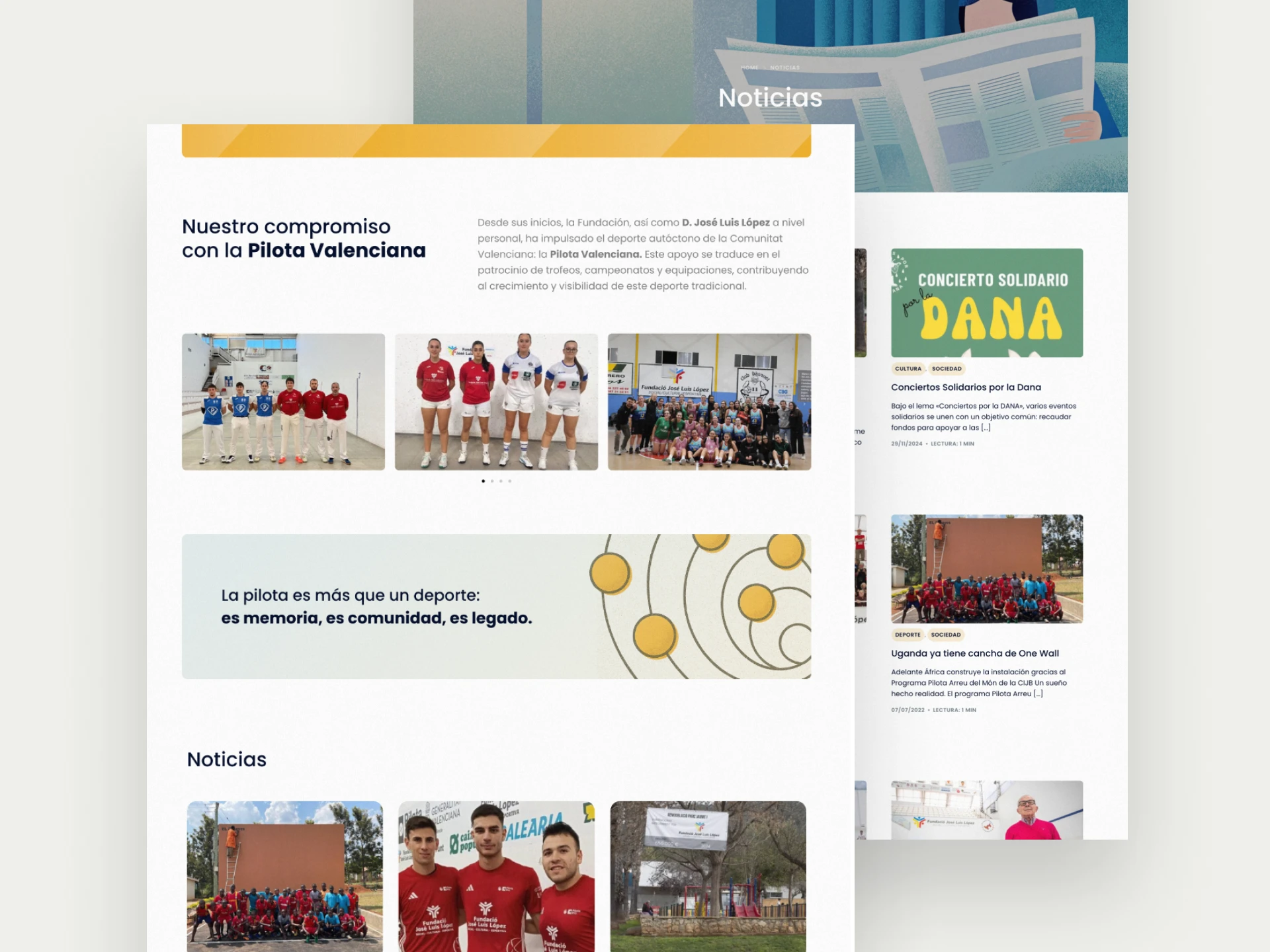 Rediseñamos el logotipo y la tipografía de la Fundació José Luis López, creando una identidad corporativa coherente y un sistema de ilustraciones originales. A partir de esto, desarrollamos una web a medida que organiza claramente sus áreas de actuación —Social, Cultural y Deportivo—, destaca su vínculo con la Pilota Valenciana y permite subir y mostrar todos los proyectos que organiza o en los que colabora a través de su blog.